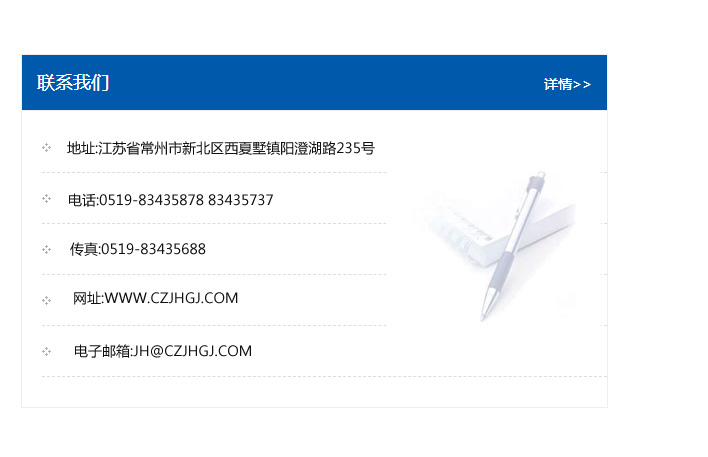 地址:常州市新北區(qū)友邦商務(wù)大廈1幢16、17層  電話:0519-85101652  傳真:0519-85112595  郵編:213022  網(wǎng)址:www_cz-jiayue_cn.hdhuiteng.com  郵箱:xiajifengaa@163.com